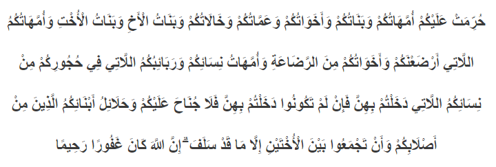 Artinya: Diharamkan atas kamu (mengawini) ibu-ibumu, anak-anakmu yang , saudara-saudaramu yang , saudara-saudara bapakmu yang , saudara-saudara ibumu yang , anak dari saudara-saudaramu yang , ibu-ibumu yang menyusui kamu, saudara sepersusuan, ibu-ibu istrimu (mertua), anak-anak istrimu yang dalam pemeliharaanmu dari istri yang kamu campuri, tetapi jika kamu belum campur dengan istrimu itu (dan sudah kamu ceraikan), maka tidak berdosa kamu mengawininya, (diharamkan bagimu) istri-istri anak kandungmu (menantu), dan menghimpunkan (dalam perkawinan) dua bersaudara, kecuali yang telah terjadi pada masa lampau, sesungguhnya Allah Maha Pengampun lagi Maha Penyayang. (QS. An-Nisa: 23).